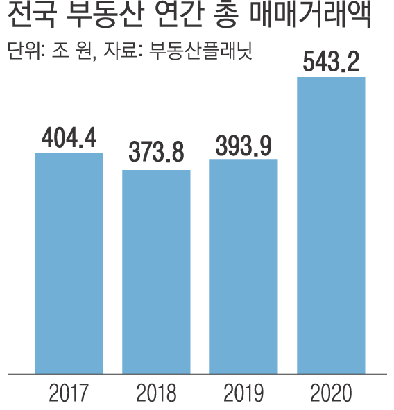 부동산 정보 플랫폼 부동산플래닛이 2020년 1~12월 전국 부동산 실거래가 자료를 분석한 결과, 지난해 부동산 매매 거래액은 총 543조2000억원을 기록해 전년(393조9000억원) 대비 37.9% 증가했다. 연간 부동산 매매 거래액이 500조원을 넘어선 건 지난해가 처음이다. 직전 최고치였던 2015년(411조3000억원)보다 131조9000억원 늘어난 수치다.