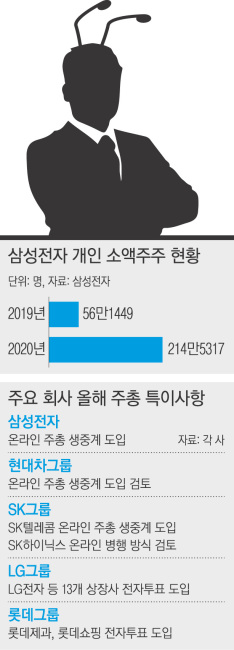 삼성전자가 다음달 17일 경기 수원컨벤션센터에서 정기 주주총회를 개최한다. 지난해 ‘동학개미운동’으로 삼성전자 주주 수가 역대 최대를 기록한 가운데 열리는 이번 주총은 사상 처음으로 온라인 생중계된다.
