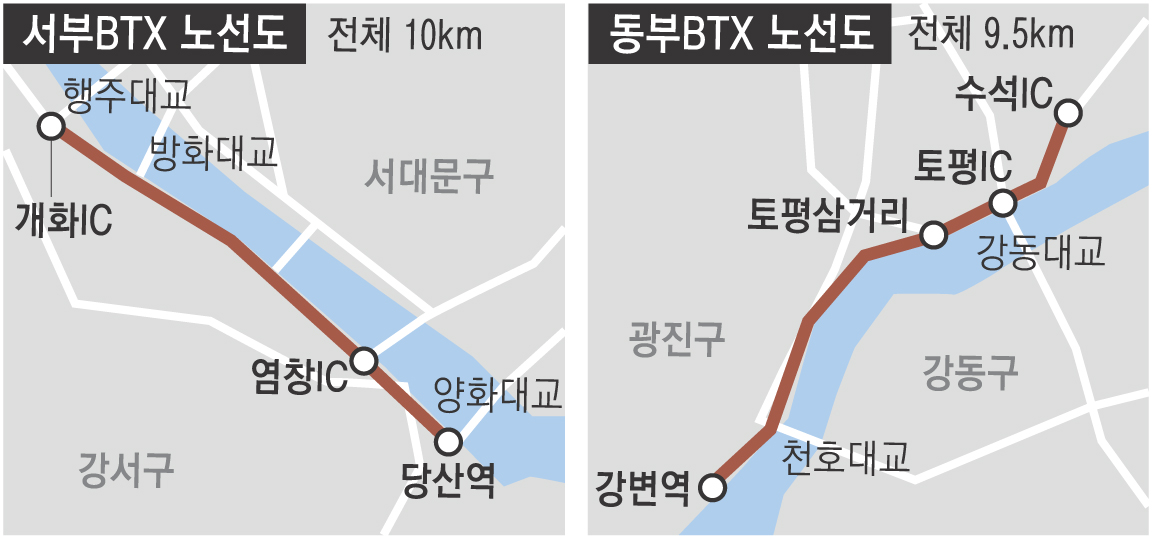교통정체가 심한 올림픽대로 행주대교~당산역 구간과 강변북로 수석IC(남양주)~강변역 구간에 버스전용차로의 일종인 ‘고속간선급행버스(BTX)’가 도입된다.