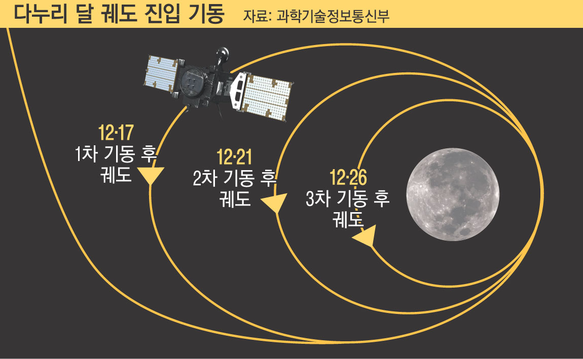 한국의 첫 달 궤도선 다누리가 예정된 달 궤도에 최종 진입하는 데 성공했다.