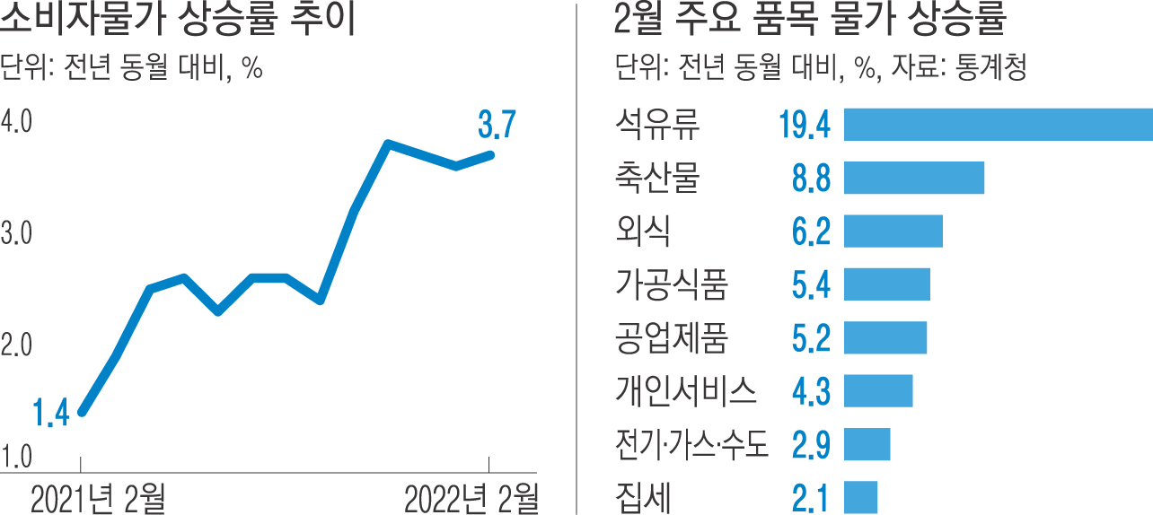 물가 상승 흐름이 장기화되는 양상을 보이고 있는 데다 최근 우크라이나 사태로 원자재 등의 수급 차질도 심화될 것으로 전망돼 물가 상승 곡선이 더 가팔라질 수 있다는 우려가 나온다.