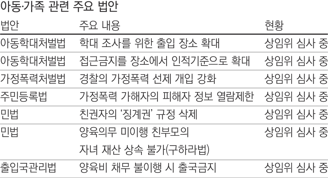 현재 국회 상임위에는 90건에 달하는 아동학대 예방 관련 법안이 계류돼 있다. 경찰이나 아동학대 전담 공무원이 학대 문제를 조사할 수 있는 장소가 ‘신고된 현장’에 국한돼 이를 확대하는 내용의 아동학대처벌법이 발의됐으나 상임위 심사를 끝내지 못했다. 가해자에 대한 ‘100m 이내 접근금지’ 규정도 마찬가지다. 접근 기준이 주거시설이나 학교, 보호시설 등 ‘장소’로 규정돼 있어 ‘피해아동’과 같은 인적 기준으로 바꿀 필요가 있지만 법적 보완은 이뤄지지 못했다. 여론의 관심을 받은 법안들도 진척되지 못했다. 양육 의무를 이행하지 않은 친부모가 자녀의 재산을 상속받지 못하도록 하는 민법 개정안은 가수 고 구하라씨의 사례와 맞물려 주목받았다. 하지만 법무부 등은 “상속 결격 사유에 대한 해석상의 다툼이 있을 수 있다”며 신중한 입장이다. 민법상 친권자의 ‘징계권’ 규정을 삭제하는 법안은 법무부가 적극적으로 추진했지만, 구체적인 법안이 지난 10월에야 상임위에 접수되며 한 해를 넘기게 됐다.