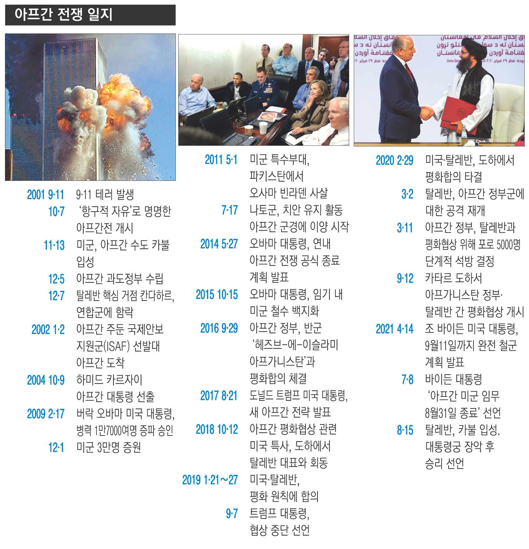 미국은 2001년 9·11테러 이후 오사마 빈라덴이 숨어 있는 아프가니스탄을 공격해 두 달 만에 탈레반 정권을 초토화시켰다. 하지만 지금 다시 탈레반이 장악한 아프간이 정상국가로 작동할 수 있을지는 미지수로 보인다.