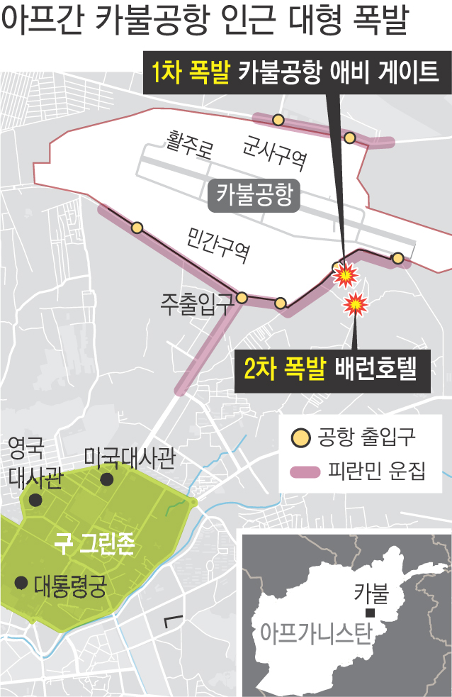 아프가니스탄인들과 미국인, 동맹국 국민들의 대피가 진행되던 카불 공항 바깥에서 26일(현지시간) 자살폭탄 테러가 발생하자 현장은 아비규환 상태에 빠졌다.