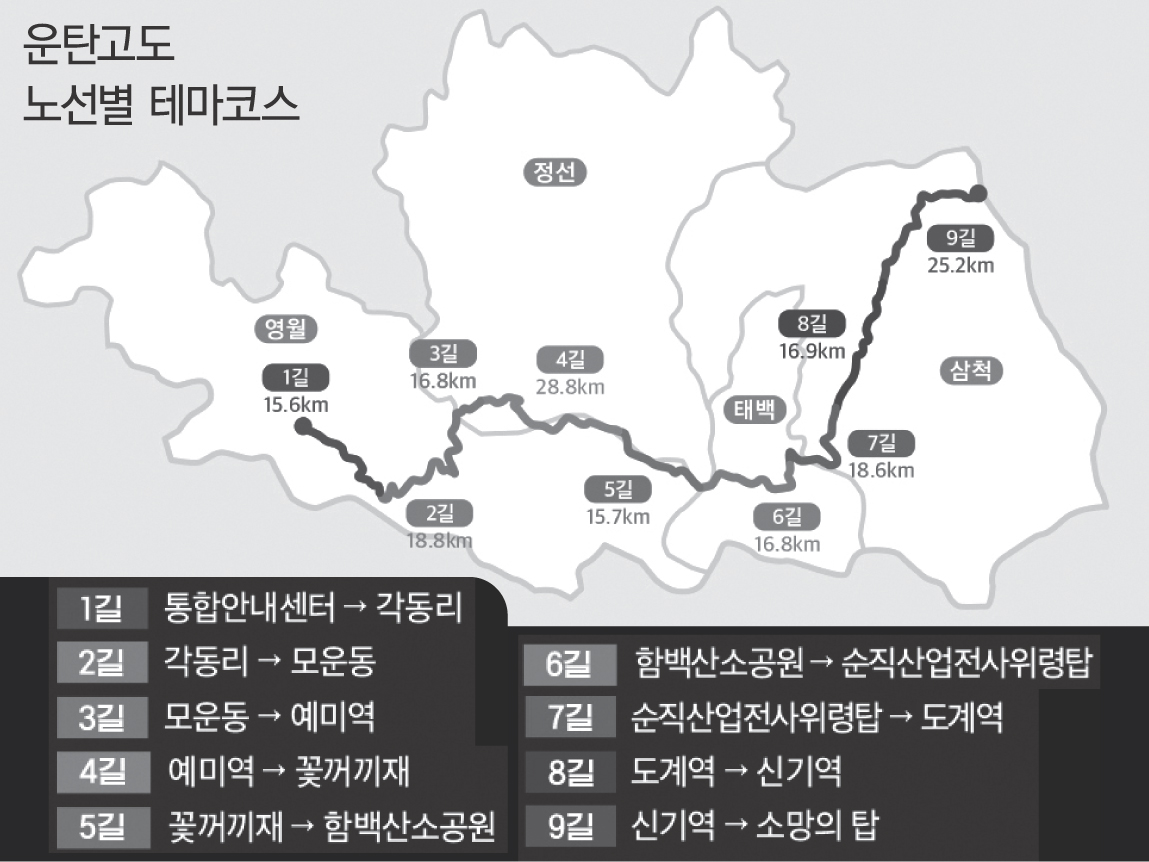 영월·정선·태백·삼척 등 강원도 내 폐광지역 4개 시·군의 석탄 운송길과 숲길 등을 연결한 총길이 173㎞의 트레킹 로드인 ‘운탄고도(運炭高道) 1330’이 오는 9월 개통된다.