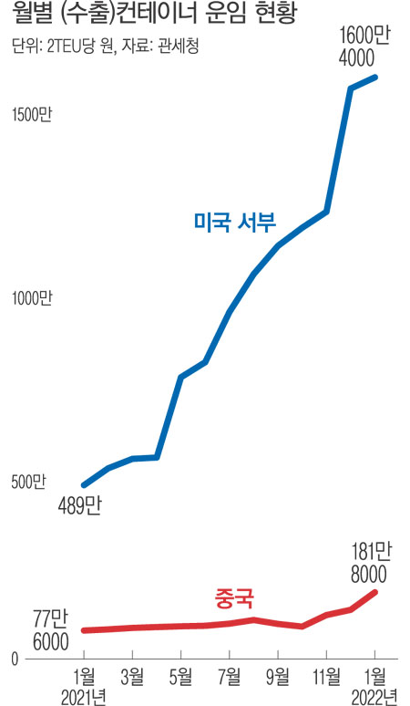 관세청이 15일 발표한 ‘1월 수출 컨테이너 운임 현황’을 보면 지난달 미국 서부행 해상 수출 컨테이너의 2TEU(40피트짜리 표준 컨테이너 1대)당 평균 신고운임은 1600만4000원으로 파악됐다.
