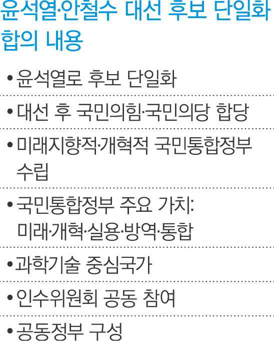 대선 후보 단일화, 국민의힘과 국민의당 합당, 윤 후보 당선 시 국민의당의 대통령직 인수위와 정부 구성 참여까지 합의안에 담겼다.