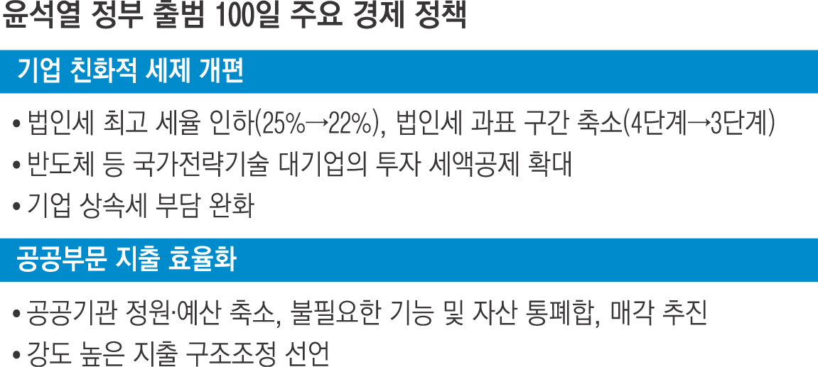 3고(고물가·고금리·고환율)와 저성장이 맞물린 ‘복합위기’ 우려 속에서 윤석열 정부가 취임 100일간 내놓은 대책은 ‘감세’였다.