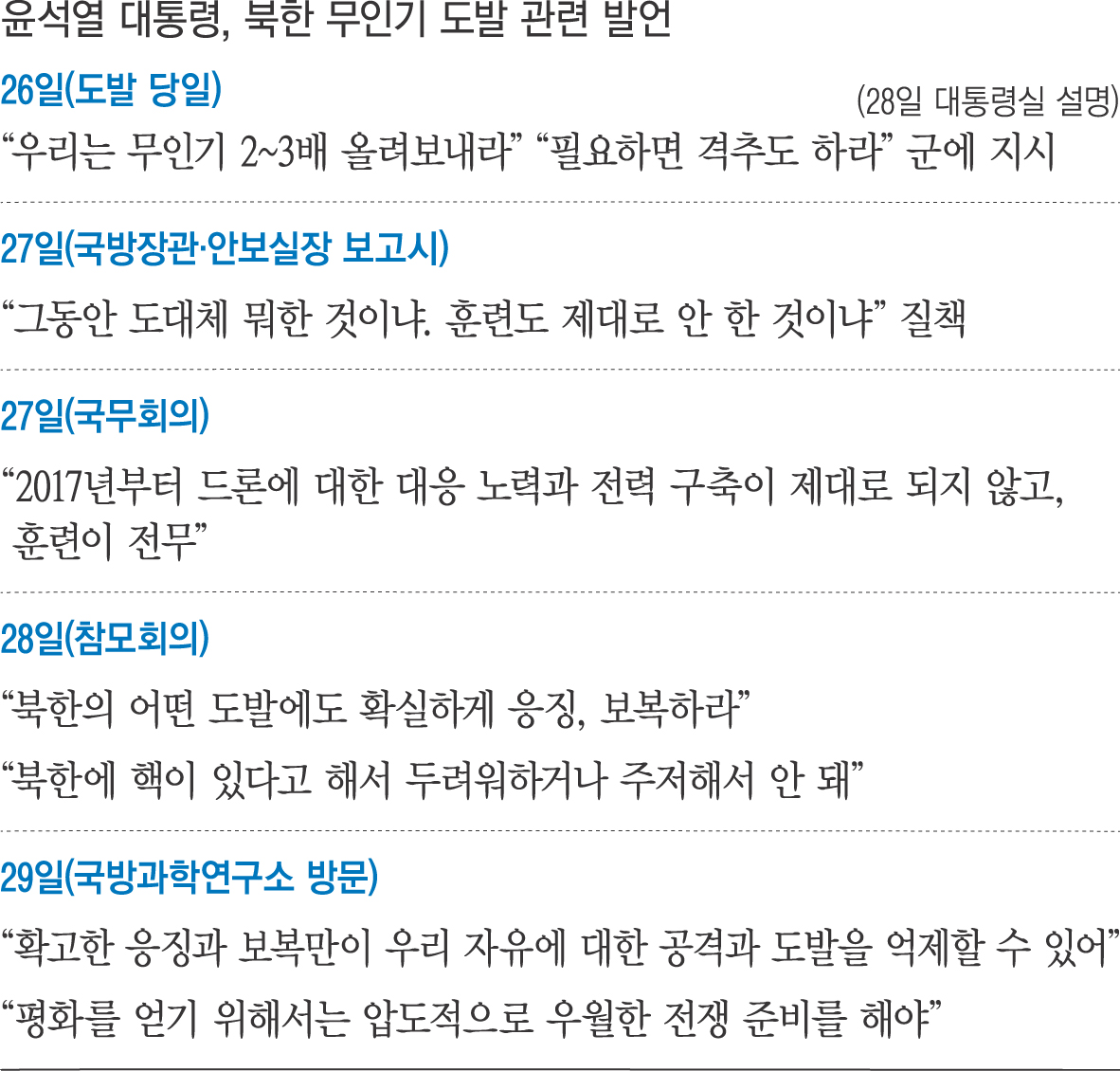 윤석열 대통령이 북한 무인기의 영공 침범과 관련해 연일 초강경 발언을 쏟아내고 있다.