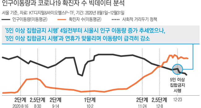 정부가 코로나19 확산을 막기 위해 지난해 12월23일부터 실시한 ‘5인 이상 집합금지’ 조치 후 인구 이동량이 크게 감소했다는 ‘빅데이터’ 분석 결과가 나왔다. 7일 KT가 공개한 지난해 코로나19 유행 시기 유동인구 변화와 소셜미디어 언급량 등 빅데이터를 분석한 결과, 서울시의 인구 이동량은 ‘5인 이상 집합금지’ 시행 직전인 12월19일부터 23일까지 1.26% 증가한 것으로 나타났다.
