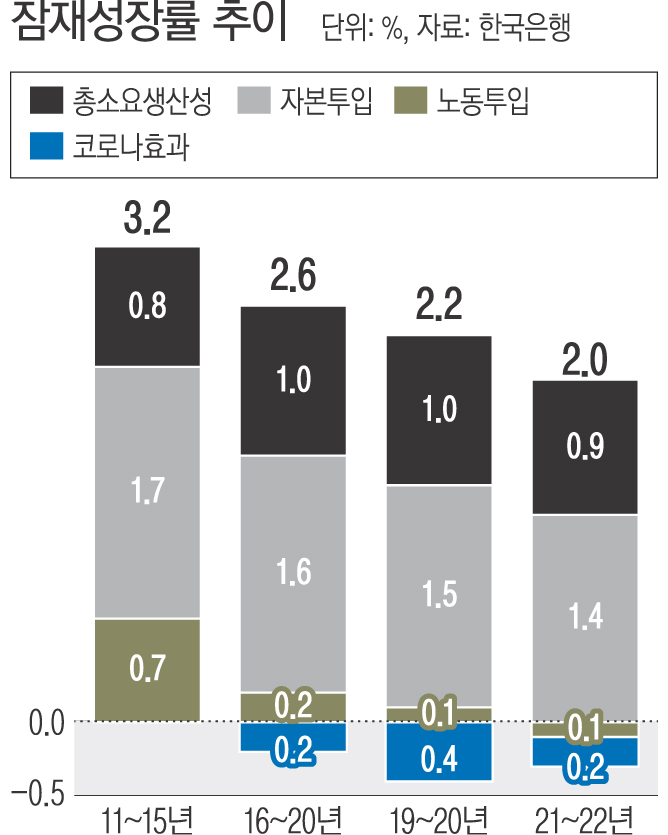 코로나 충격은 2019~2020년 한국의 잠재성장률을 0.4%포인트가량 끌어내린 것으로 분석된다.