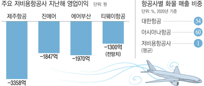 LCC들은 지난해 매출 50~60%를 화물 부문에서 올린 대한항공이나 아시아나항공처럼 화물 운송을 회생의 돌파구로 삼을 수도 없는 형편이다. 화물용 컨테이너를 실을 수 있는 화물기를 보유한 LCC는 한 곳도 없다. 화물 운송 경험이 부족해 물류 네트워크를 구축하지 못한 데다 화물 품목이 의류나 섬유 등 주로 단가가 낮은 품목으로 제한돼 있다.