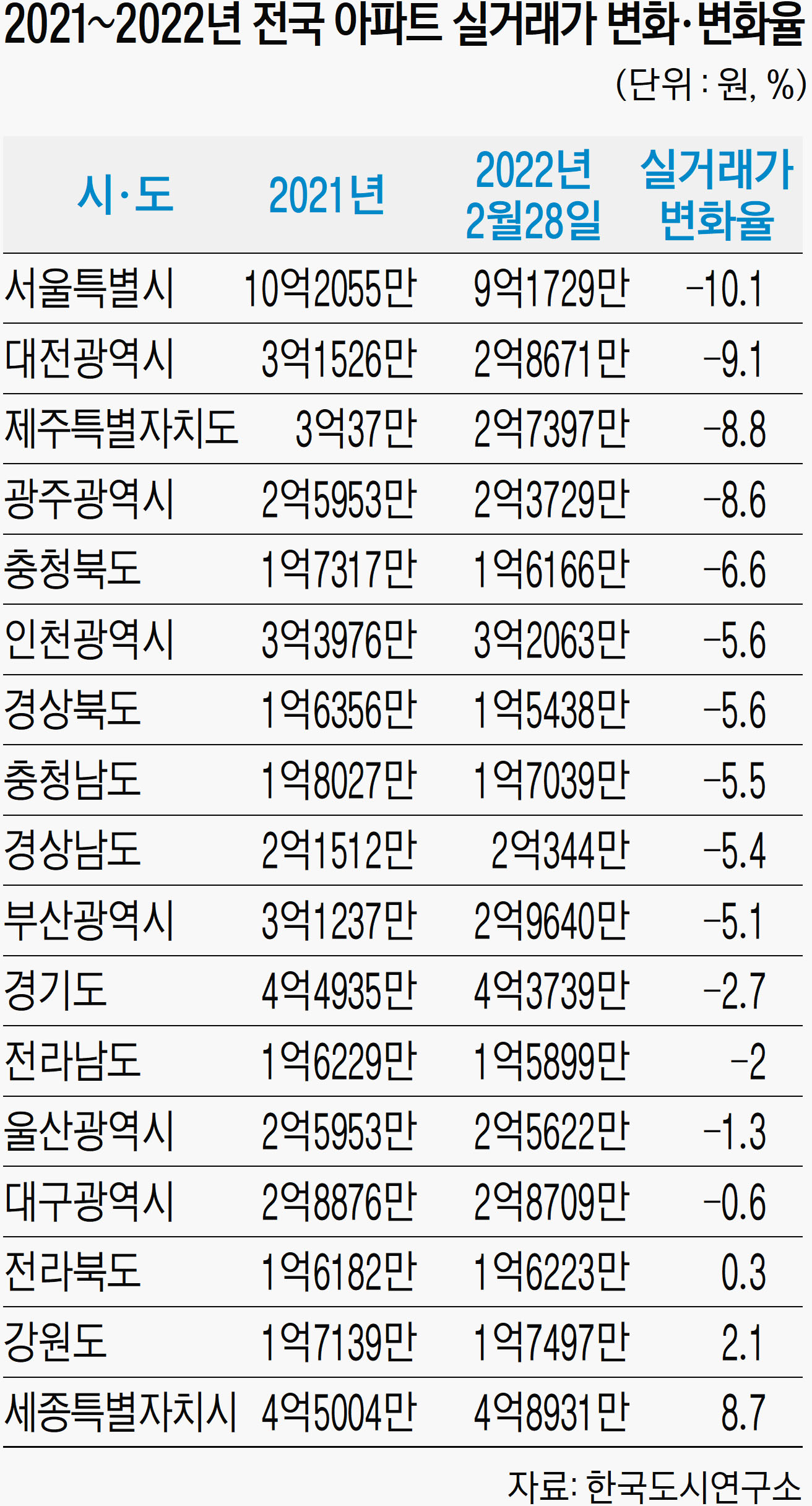 전국 17개 시·도 중 세종·강원 등 3곳을 제외한 14곳에서 실거래가가 높게는 8~9%대까지 떨어졌다.