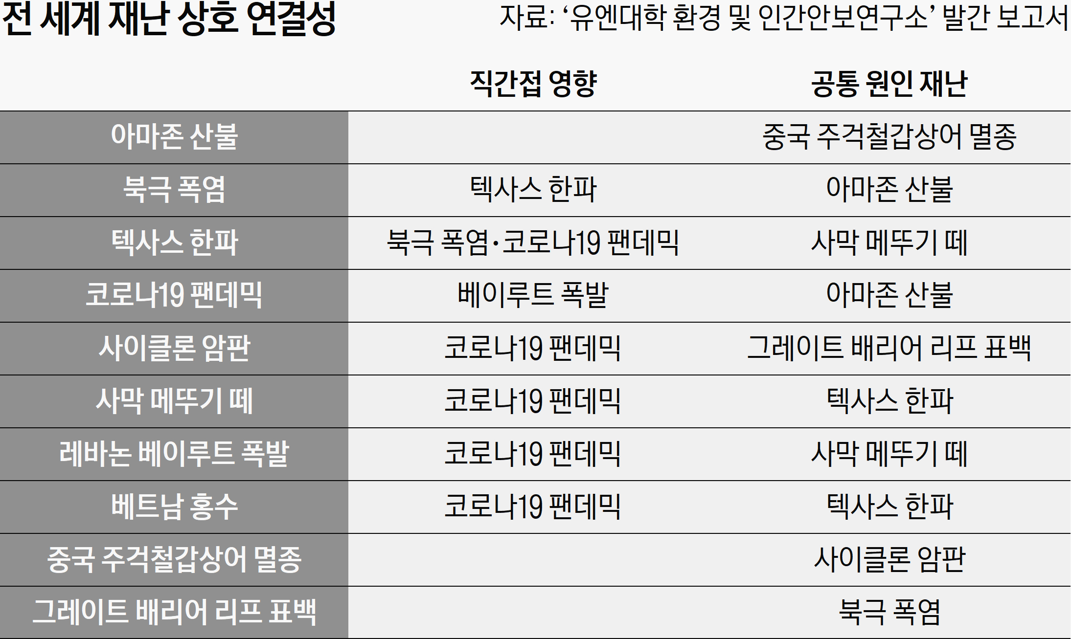 지난 1년 전 세계 각기 다른 장소에서 발생한 별개의 재난들이 탄소 배출과 환경 파괴를 고리로 서로 밀접하게 연결돼 있다는 유엔 산하 싱크탱크의 보고서가 나왔다.