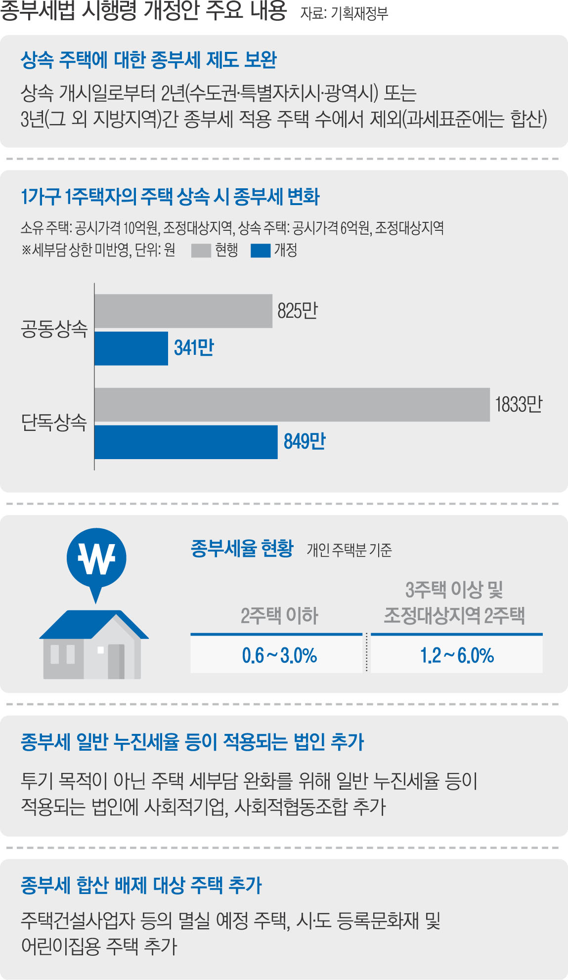 6일 기획재정부가 발표한 종부세법 시행령 개정안을 보면, 종부세율을 적용할 때 수도권·특별자치시·광역시 소재 주택일 경우 상속개시일(사망일)로부터 2년간(이외 지방 지역은 3년간) 주택 수에서 제외하기로 했다.