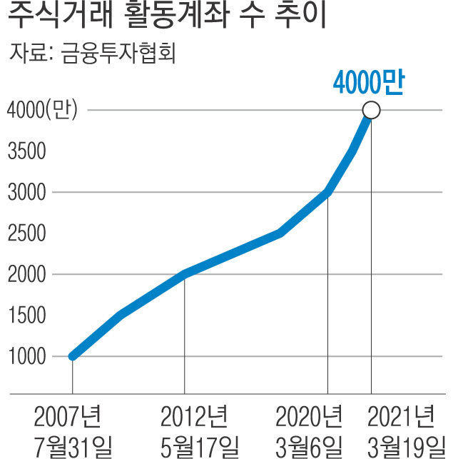 개인 투자자들의 주식 매수 열풍에 힘입어 주식거래 활동계좌 수가 4000만개를 돌파했다. 1년 만에 1000만개가 늘었다.