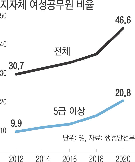 지난해 지방자치단체 여성공무원 비율이 서울과 부산에서 처음으로 50%를 넘은 것으로 나타났다.