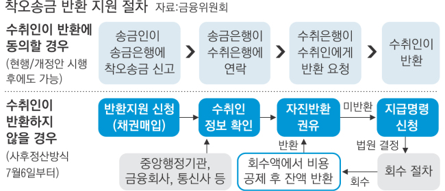 금융위원회는 9일 이 같은 내용을 담은 ‘예금자보호법 시행령’ 일부 개정안을 입법예고했다. 현행 제도에서는 돈을 받을 금융회사나 수취인 계좌번호를 잘못 기재하거나 입력했을 때 돈을 돌려받으려면 수취인의 동의를 받아야 한다. 문제는 거절할 경우다. 이럴 경우 통상 6개월 이상의 시간과 60만원(송금액 100만원 기준) 이상의 비용이 드는 소송을 해야 한다. 오는 7월6일 개정안이 시행되면 수취인이 반환을 거절할 경우 ‘착오송금 반환 지원 제도’ 이용을 신청할 수 있다.