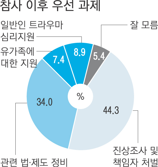 ‘관련 법·제도 정비’(34%), ‘시민 트라우마 심리지원’(8.9%), ‘유가족에 대한 지원’(7.4%)이 뒤를 이었다.
