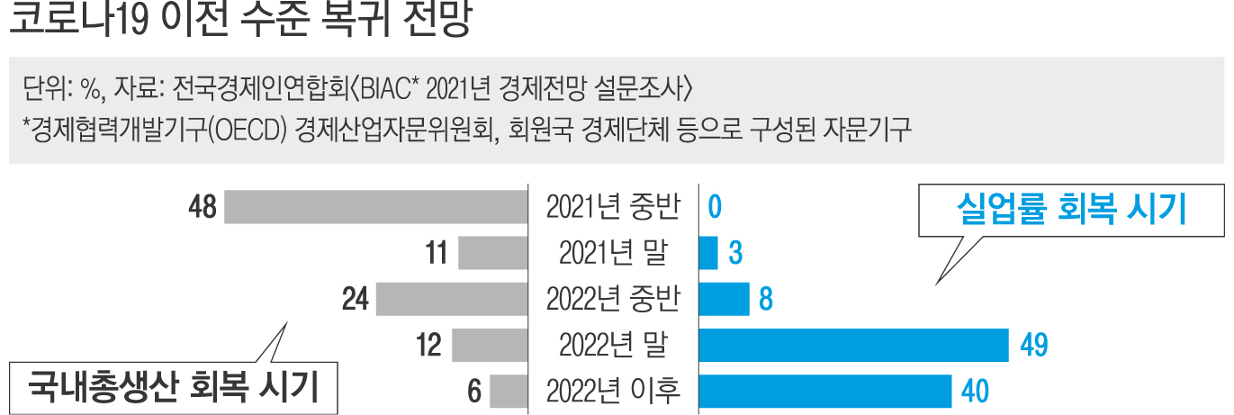 경제협력개발기구(OECD) 회원국 경제단체의 절반가량은 올해 중반이면 각국의 국내총생산(GDP)이 코로나19 이전 수준을 회복할 것으로 전망하는 것으로 조사됐다.