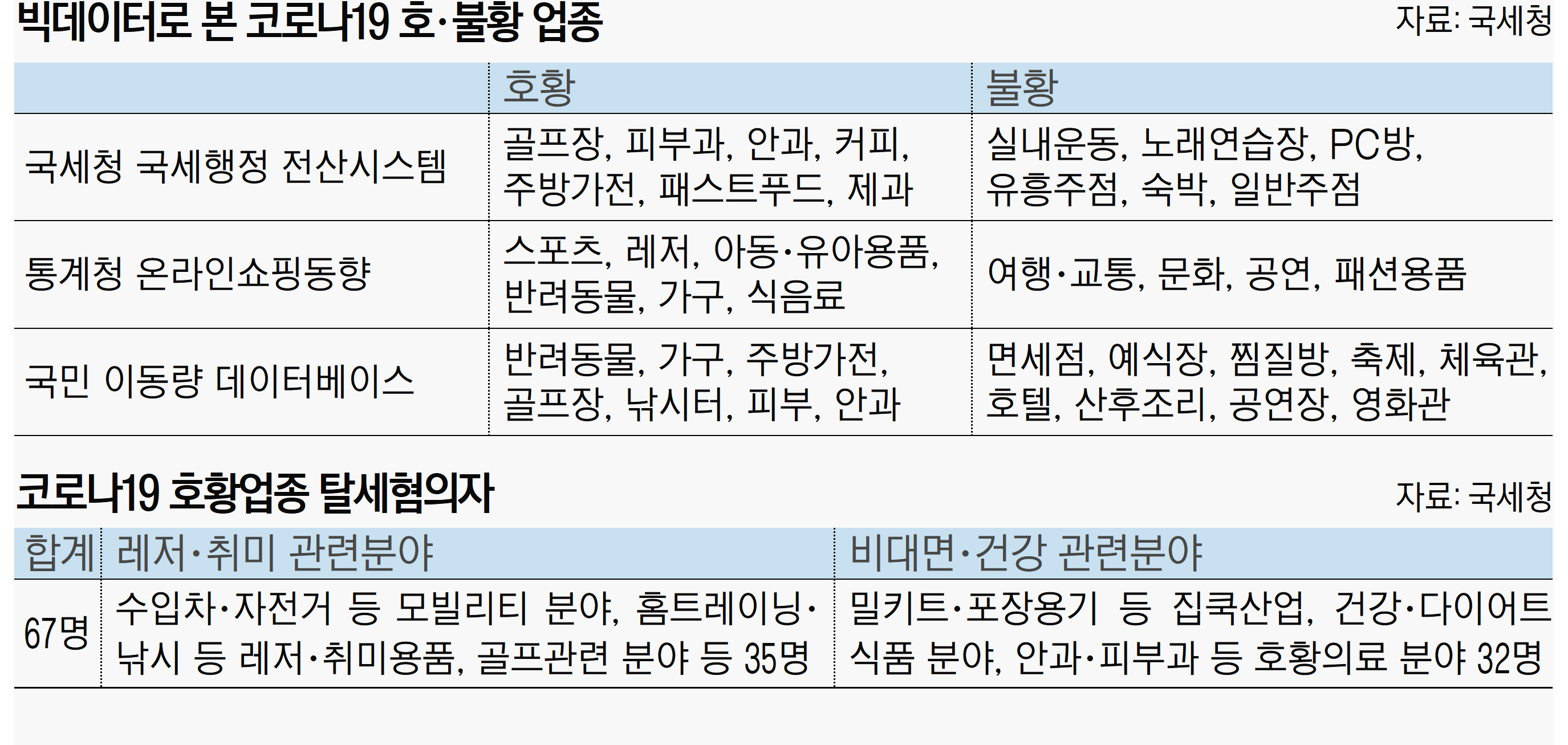 부가가치세 신고자료, 신용카드·현금영수증 자료, 온라인 쇼핑 동향, 인터넷 포털의 국민 이동량 데이터베이스를 분석해 레저·취미 및 비대면·건강 관련 분야의 매출이 증가한 것으로 나타나자 이들 업종에서 조사 대상을 추렸다고 국세청은 전했다.