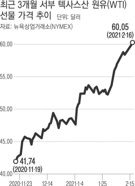 에너지 산업이 밀집해 있는 미국 텍사스주가 꽁꽁 얼어붙으면서 원유 정제시설 등이 가동을 중단하고 난방용 기름 수요가 폭증하면서다. 계란 파동 등으로 이미 올라 있는 국내 ‘장바구니 물가’도 추가 상승 압력을 강하게 받을 것으로 보인다.