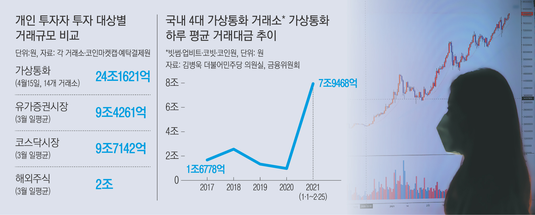 가상통화 거래 규모가 개인투자자들의 국내외 주식 거래를 넘어설 정도로 급팽창하고 있으나 이를 규제할 제도는 미비하다는 우려가 커지고 있다.