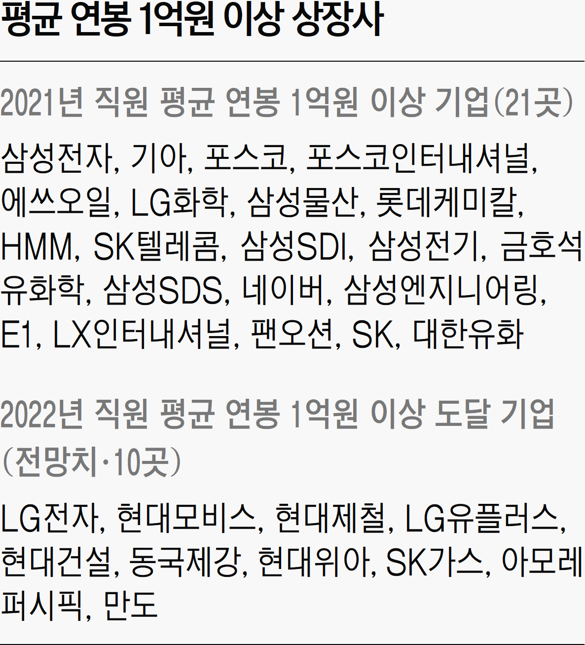 2019년 평균 연봉 1억원이 넘은 회사는 삼성전자와 에쓰오일, 삼성물산, SK텔레콤, 한화솔루션, 삼성SDS, LX인터내셔널, 대한유화 등 8곳에 불과했는데 몇 년 사이 빠르게 늘고 있다.