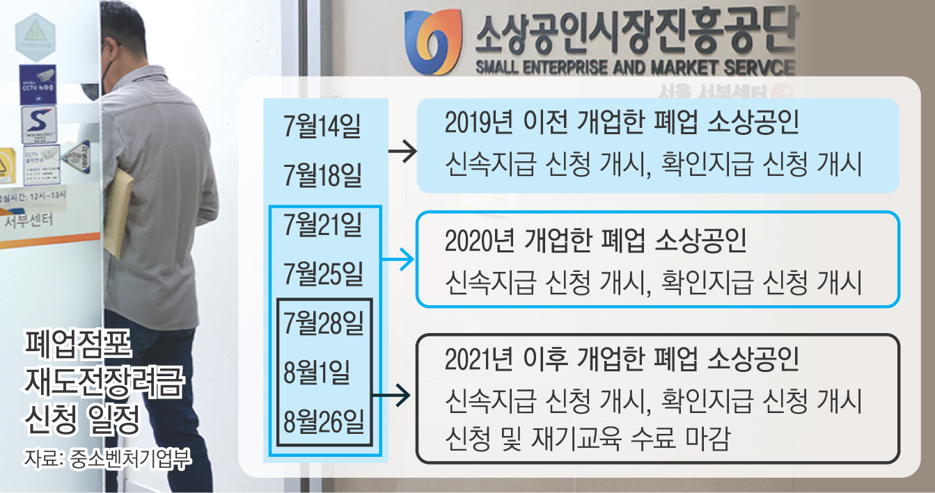 정부가 코로나19 방역 강화 이후 폐업한 소상공인 업체 5만곳에 100만원씩 총 500억원을 ‘재도전 장려금’으로 지급하기로 했다.