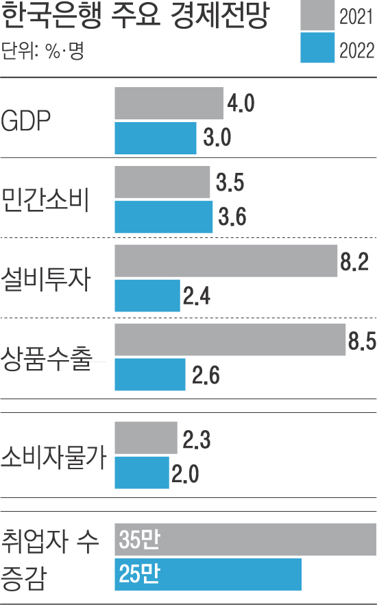 한국은행은 코로나19 4차 유행 등에도 불구하고 올해 실질 국내총생산(GDP) 성장률 전망치를 4.0%로 유지했다.