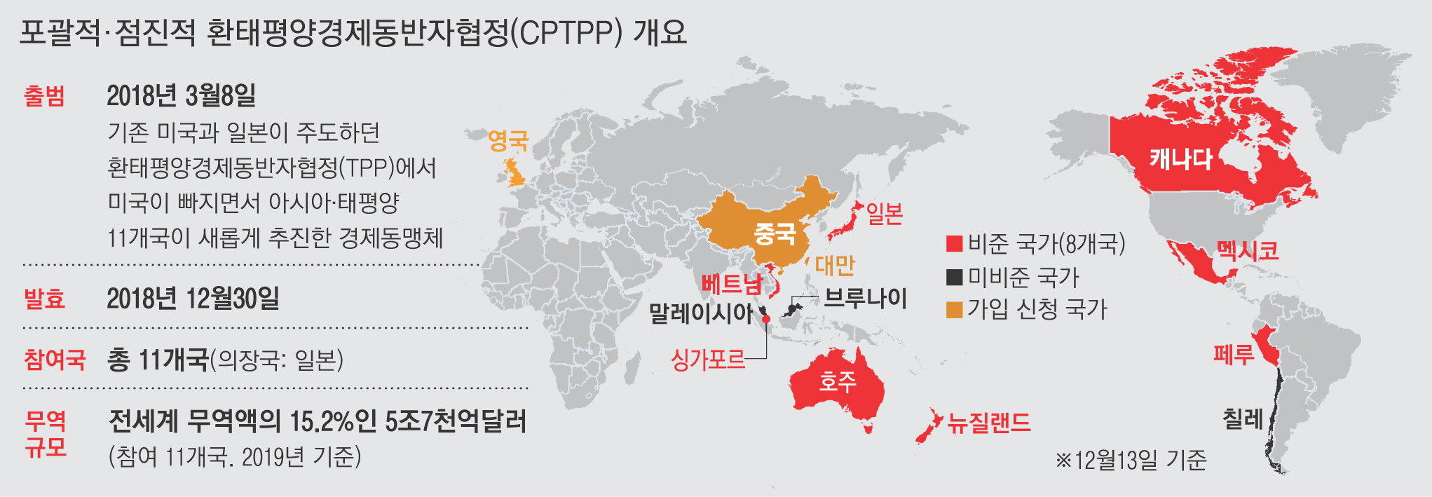 정부가 13일 포괄적·점진적 환태평양경제동반자협정(CPTPP) 가입 추진을 공식화하면서 소재·부품·장비와 기계 등 제조업 분야는 수출 다변화의 계기를 맞게 될 것으로 보인다.