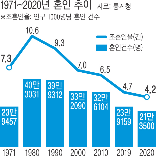 통계청이 18일 발표한 ‘2020 혼인이혼 통계’를 보면 지난해 혼인 건수는 21만3500건으로 1년 전보다 10.7% 줄었다. 감소폭은 외환위기 시절인 1997년(10.6%)보다 더 큰 것으로 1971년(-18.9%) 이래 최대치다.