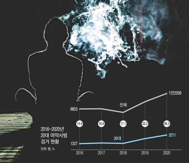 경찰이 검거한 마약사범은 지난해 1만2209명으로 전년(1만441명) 대비 16.9% 증가했다. 20대가 3211명(26.3%)으로 가장 큰 비중을 차지했다. 이어 30대 2803명(23.0%), 40대 2346명(19.2%) 순이었다. 10대 마약사범도 241명(1.9%)으로 처음으로 200명을 넘었다. 외국인 마약사범은 2016년 711명에서 2020년 1466명으로 2배 이상 늘어났다.