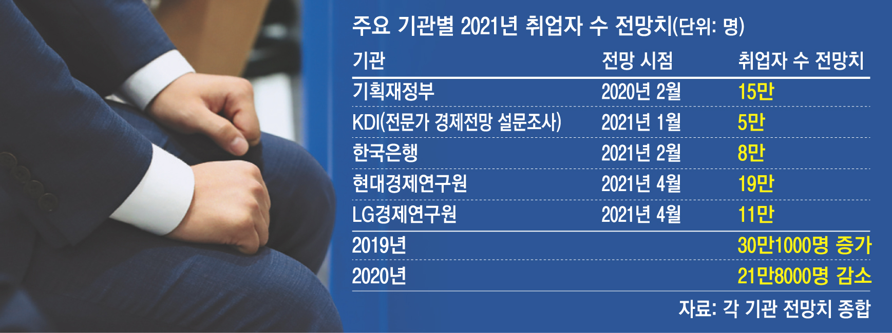 올해 1분기 한국 경제가 1.6% 깜짝 성장하면서 ‘연간 성장률 4%대’라는 낙관적 전망이 나오는 반면, 올해 취업자 수 증가폭은 코로나19 충격으로 사라진 22만개 일자리의 절반 수준인 10만명 안팎에 그칠 것이란 우려가 나온다.