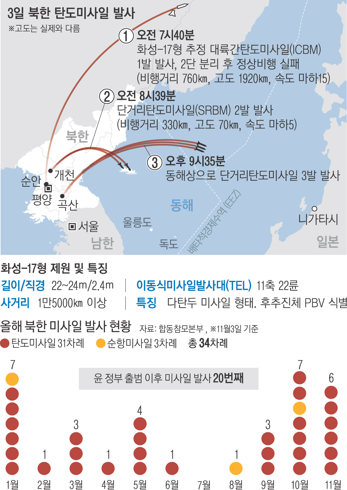 북한이 3일 대륙간탄도미사일(ICBM)까지 발사하며 한 달 넘게 이어온 도발 국면을 한층 위험한 단계로 끌어올렸다.