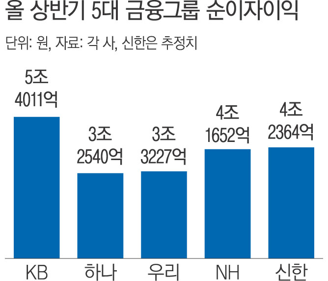 5대 금융그룹의 상반기 순이자이익이 반기 기준으로 사상 처음 20조원을 넘은 것으로 추산된다.