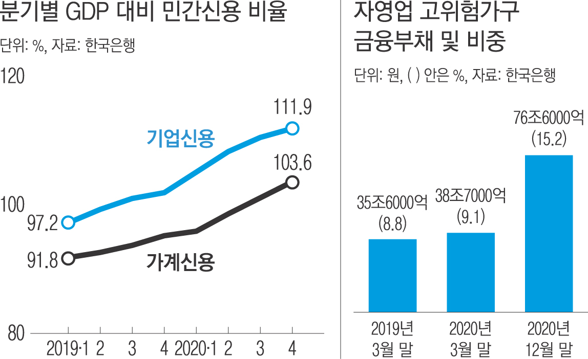 코로나19 충격으로 가계와 기업 모두 빚을 크게 늘리면서 민간 부문의 빚(신용)이 나라 전체 경제 규모의 두 배를 훌쩍 넘어섰다.