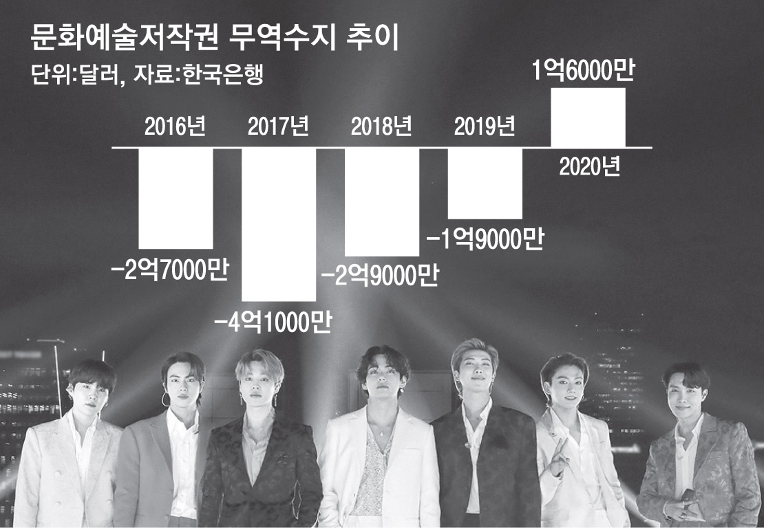 지난해 방탄소년단(BTS) 등 K팝과 국내 드라마·웹툰 콘텐츠가 세계적으로 인기를 끌면서 한국의 문화예술저작권 무역수지가 사상 첫 흑자를 기록했다.